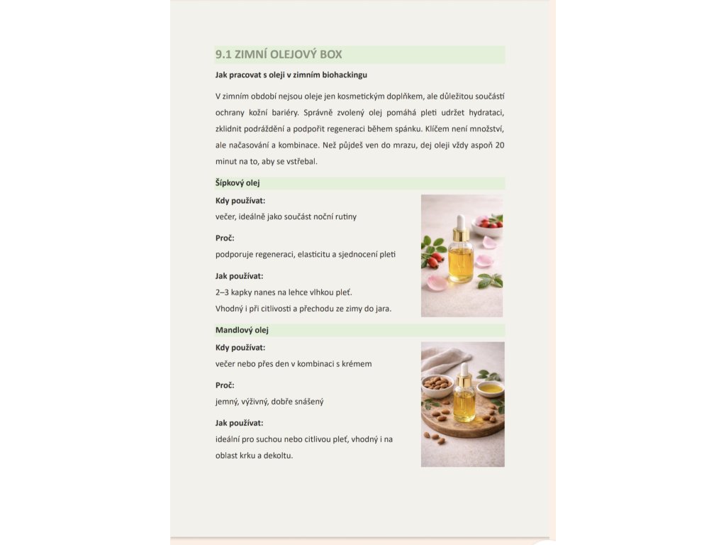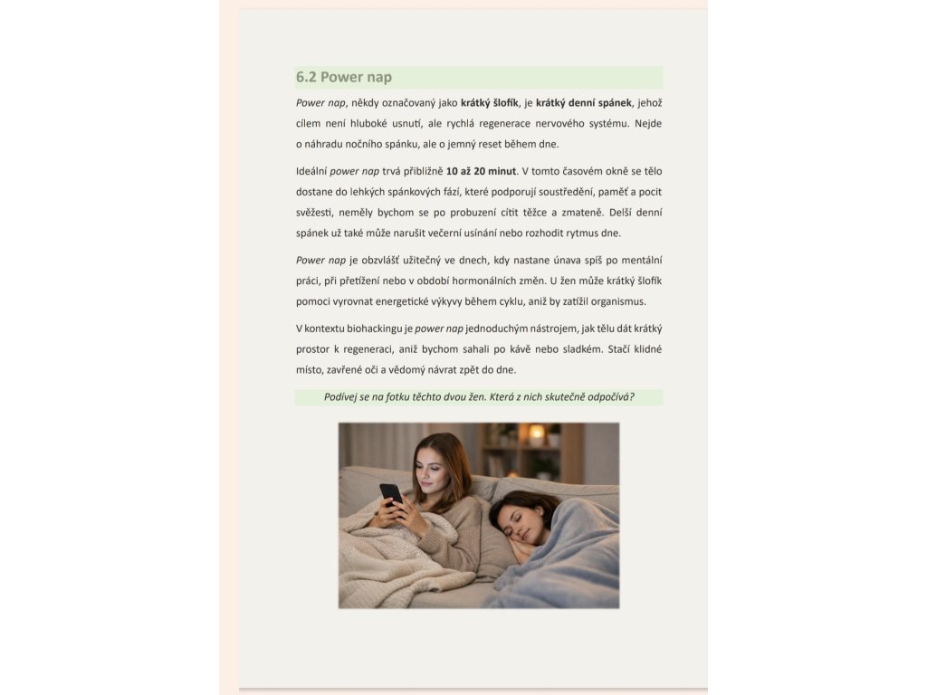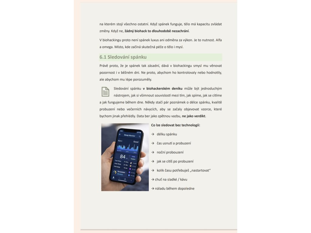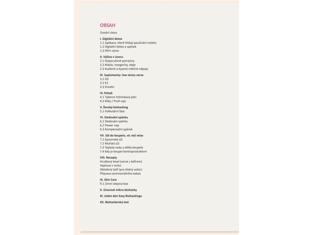 Najdeš zde kapitoly věnované spánku jako základnímu biohacku, práci s večerními návyky, sledování spánku i vědomému digitálnímu detoxu. Velký prostor dostává ženský cyklus – konkrétně folikulární fáze – s praktickými tipy na pohyb, stravu, regeneraci a péči o sebe. Součástí čísla jsou také jednoduché, výživné recepty (včetně hruškového bowlu, obloženého talíře či ceremoniálního kakaa), které podporují trávení, stabilní energii a pocit klidu.
